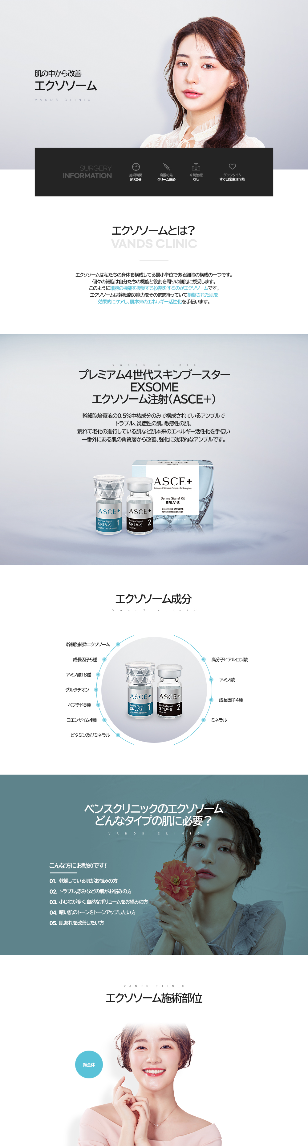 エクソソームは幹細胞の核心成分の結晶体で、幹細胞培養液を高純度分離・精製して得られたスキンブースターです。 傷ついた肌を効果的にケアし、肌本来のエネルギー活性化させます。 5種類の成長因子、6種類のペプチド、19種類のアミノ酸、4種類のコエンザイム、さらにビタミン、ミネラル、グルタチオンなど、多彩な有効成分を含有し、肌の再生と栄養補給を促進します。